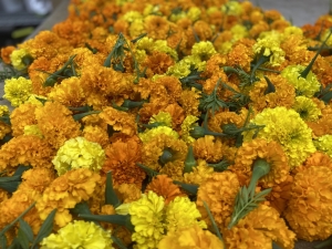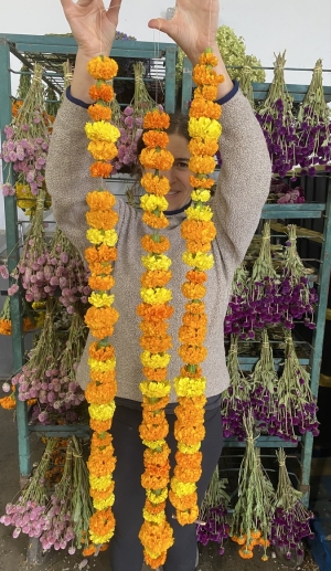 Colorful garlands made from fresh Marigold blossoms. Each 3 foot garland has approximately 30 blossoms which will dry in place and keep their color for a year or two. Certified organic.
